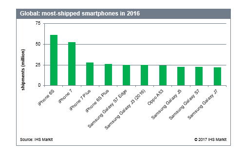 สมาร์ทโฟนจาก Apple ได้รับความนิยมมากที่สุดในปี 2016 ตามรายงานของบริษัท IHS Markit ที่ได้สรุปยอดจัดส่งสมาร์ทโฟนในปีที่ผ่านมา พบว่า iPhone มียอดจัดส่งสูงที่สุดถึง 4 รุ่น นำโดย iPhone 6s ตามมาด้วย iPhone 7, iPhone 7 Plus และ iPhone 6s Plus