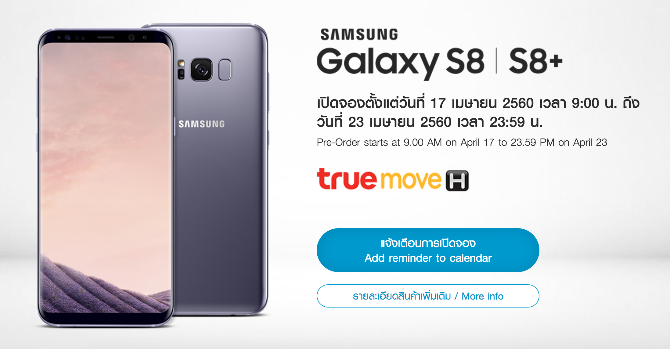 ในที่สุดค่ายแรกก็เริ่มขยับแล้วกับทาง Truemove H ที่ได้ประกาศเปิดจอง Samsung Galaxy S8 และ Galaxy S8+ สมาร์ทโฟนแฟลกชิปรุ่นใหม่ล่าสุดจากทาง Samsung ที่หลายคนรอคอย โดยจะเริ่มเปิดจองระหว่างวันที่ 17 เมษายน 2560 เวลา 9:00 น. ถึง วันที่ 23 เมษายน 2560 เวลา 23:59 น. มีให้เลือก 3 สีคือสีทอง สีดำ และสีม่วง ส่วนราคาทางการคาดว่าน่าจะทราบในวันเปิดจองวันแรก