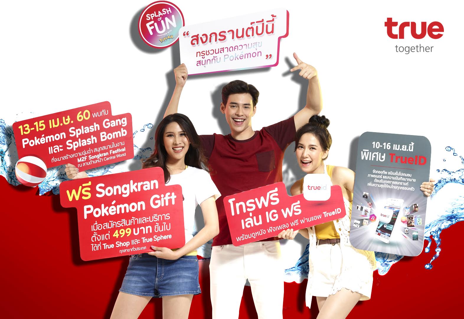 ทรู ร่วมฉลองเทศกาลสงกรานต์ 2560 ชวนสาดความสุข สนุกด้วยกันกับ โปเกมอน ในแคมเปญ “Splash of Fun Together with Pokémon” พบกับกิจกรรมและสิทธิพิเศษดีๆ มากมาย ตลอดทั้งเดือนเมษายน จัดเต็มความสุข 3 ต่อเพื่อเอาใจลูกค้าทรูโดยเฉพาะ สุขที่ 1 – โทรฟรี เต็มอิ่ม 1 วัน รับสิทธิ์ถึง 30 เม.ย. 2560 เล่น IG ฟรี สำหรับลูกค้าทรูมูฟเอชทั้งแบบรายเดือนและแบบเติมเงิน