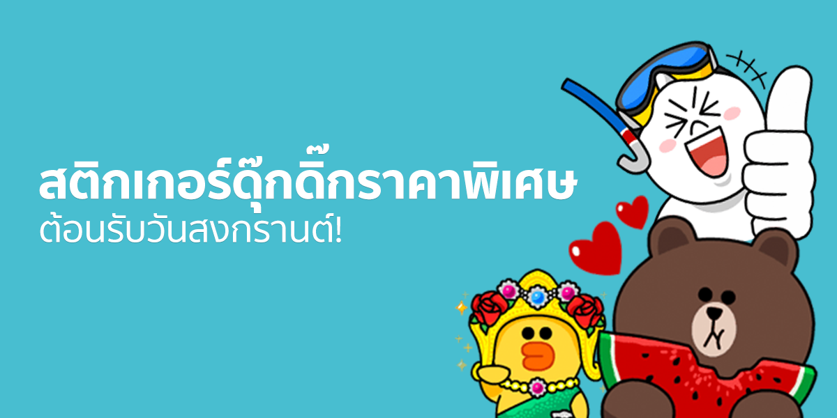LINE ประเทศไทย ปล่อยโปรโมชันพิเศษ ต้อนรับวันสงกรานต์ ลดราคา สติกเกอร์ 9 เซตยอดนิยมทั้ง LINE คาแรคเตอร์ นายหนวดเข้ม น้องสไบ ติดลม หนูหิ่น น้องข้าวหอม หัวกะลา และหนังตะลุงไปเลือกซื้อกันได้ที่ https://store.line.me/stickershop/editorspick/494