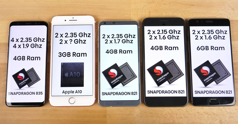 EverythingApplePro เคยจับ Samsung Galaxy S8 กับ iPhone 7 Plus มาเปรียบเทียบกันแล้วก่อนหน้านี้ แต่ล่าสุดได้เพิ่มสมาร์ทโฟนเรือธงเข้ามาเปรียบเทียบพร้อมกันอีก 3 รุ่น คือ LG G6, Google Pixel และ OnePlus 3T ส่วนการทดสอบจะใช้วิธีการเข้า-ออกแอพพลิเคชั่นต่างๆ แล้วจับเวลาเพื่อหาว่ารุ่นไหนจะตอบสนองการทำงานได้เร็วที่สุด ซึ่งถือว่าเป็นการทดสอบโดยใช้พื้นฐานจากการใช้งานจริง