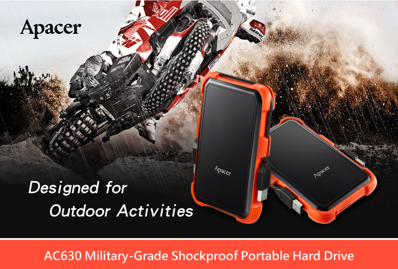 ในขณะที่ความสนใจในกิจกรรมแอดเวนเจอร์นั้นเติบโตขึ้นอย่างรวดเร็ว และความต้องการในการเก็บภาพถ่ายหรือวีดีโอระหว่างกิจกรรมนั้นก็เป็นไปในทิศทางเดียวกัน และเมื่อเกิดเหตุไม่คาดฝันขึ้นกับตัวไดร์ฟ ไม่ว่าจะเป็นการตกหล่น จมน้ำ หรือตกลงบนพื้นทราย ก็อาจจะก่อให้เกิดความเสียหายต่อข้อมูลที่เก็บไว้ในตัวไดร์ฟได้ Apacer ได้พัฒนาฮาร์ดไดร์ฟพกพาแบบกันกระแทกรุ่นล่าสุดนี้ ให้สามารถต้านทานต่อสภาพการใช้งานสุดหฤโหดได้ โดย AC630 ผ่านมาตรฐานการปล่อยหล่นจากที่สูงของสหรัฐอเมริกา MIL-STD-810G 516.6 แบบขั้นตอน 4 (Transit drop test) นั้นหมายถึงตัวไดร์ฟสามารถทนต่อการปล่อยหล่นจากความสูง 1.22 เมตรได้โดยไม่ก่อให้เกิดความเสียหายต่อข้อมูลภายในไดร์ฟ ประกอบกับเรตติงการทนต่อสภาพแวดล้อมระดับ IP55 ที่ทำให้ AC630 นั้นสามารถปกป้องตัวเองจากสภาพแวดล้อมอันโหดร้ายตั้งแต่ฝุ่นละออง จนถึงสายน้ำ ทำให้ผู้ใช้สามารถพกพาเดินทางไปได้ทุกที่โดยไม่ต้องกังวลใจ