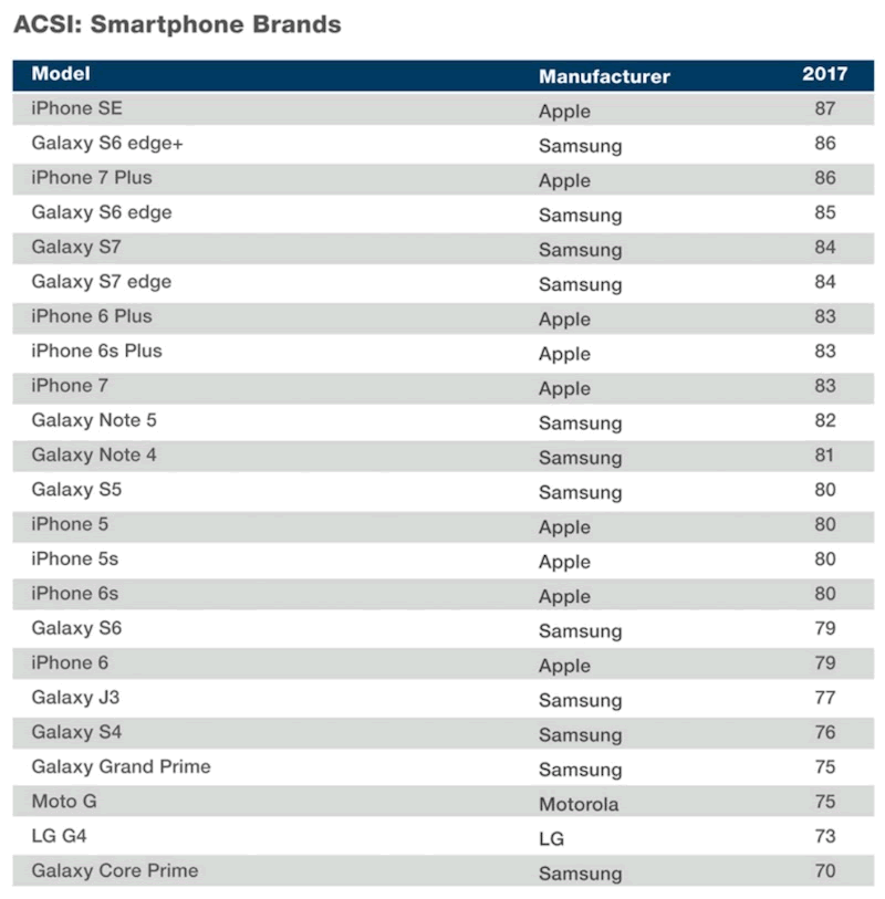 ผลสำรวจล่าสุดของ ACSI พบว่า iPhone SE ได้รับคะแนนความพึงพอใจสูงที่สุด 87 จาก 100 คะแนน รองลงมาคือ Samsung Galaxy S6 edge+ ที่มีขนาดจอแสดงผล 5.7 นิ้ว อันดับที่ 3 ได้แก่ iPhone 7 Plus ซึ่งมี ขนาดจอแสดงผล 5.5 นิ้ว ตามมาด้วยสมาร์ทโฟนจาก Apple และ Samsung เกือบ 20 เครื่อง ได้คะแนนอยู่ในช่วง 75 – 85 คะแนน