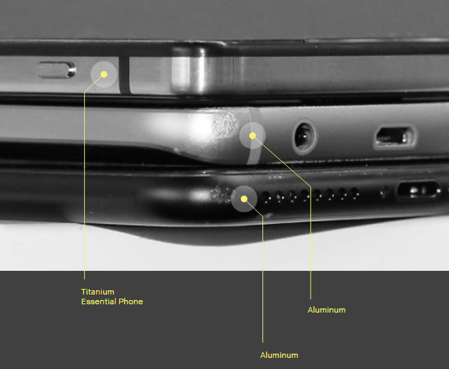 การออกแบบของ Essential Phone ก็มีความน่าสนใจไม่แพ้กัน เห็นได้ชัดเจนว่าแผงด้านหน้าเต็มไปด้วยจอแสดงผล มีขอบจอบางเฉียบ บอดี้ใช้วัสดุไททาเนียม ซึ่งมีความทนทานกว่าอลูมิเนียม โดยมีการ Drop Test เปรียบเทียบกับสมาร์ทโฟนที่ใช้อลูมิเนียม จะเห็นว่าส่วนมุมของวัสดุอลูมิเนียม จะเกิดรอยเมื่อทำหล่น แต่ไม่พบในวัสดุไททาเนียม นอกจากไททาเนียม แผงหลังยังใช้วัสดุเซรามิค และครอบทับด้วยกระจก Corning Gorilla Glass 5