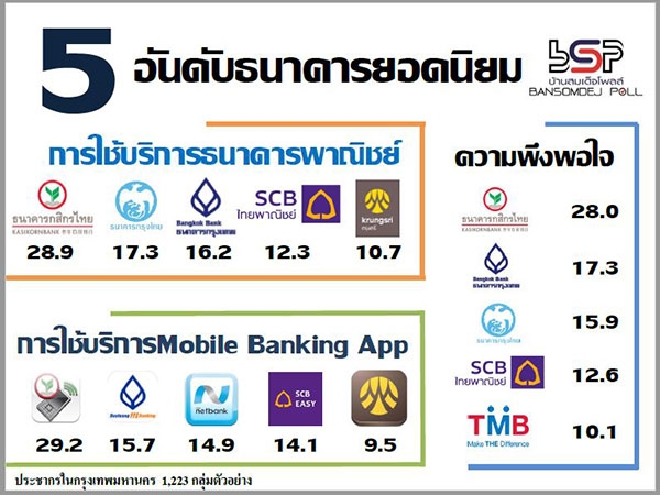 อันดับที่ 1 คือ ธนาคารกสิกรไทย ร้อยละ 28.9