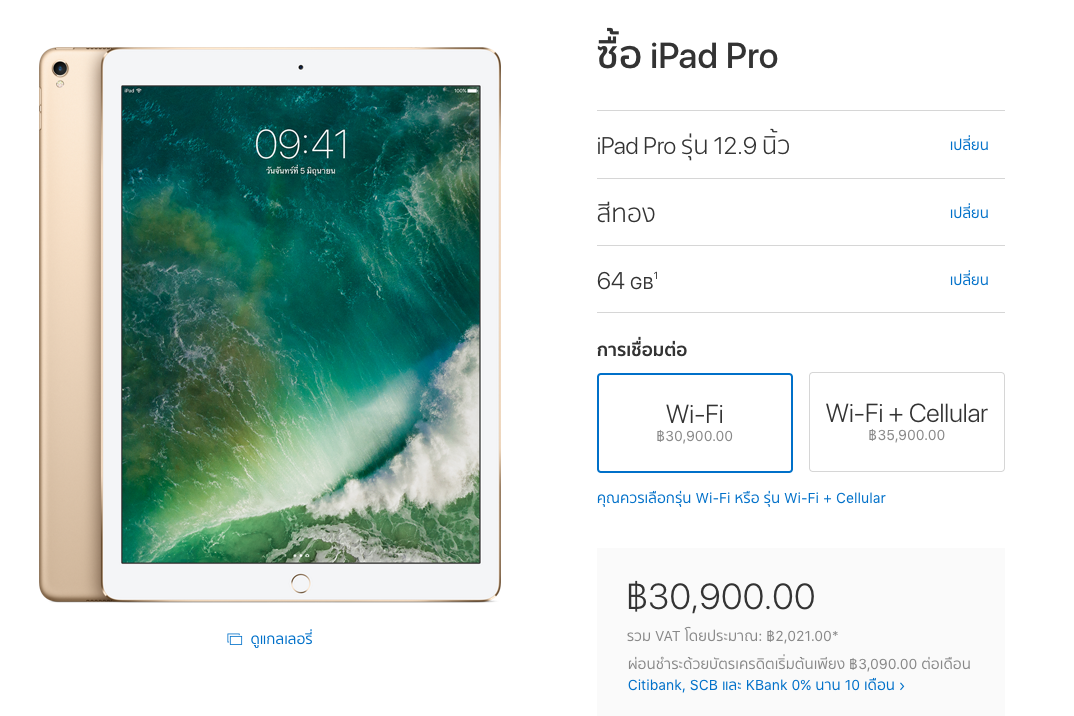 - iPad Pro ขนาด 12.9 นิ้วรุ่น Wi-Fi+Cellular ความจุ 64GB ราคา 35,900 บาท
