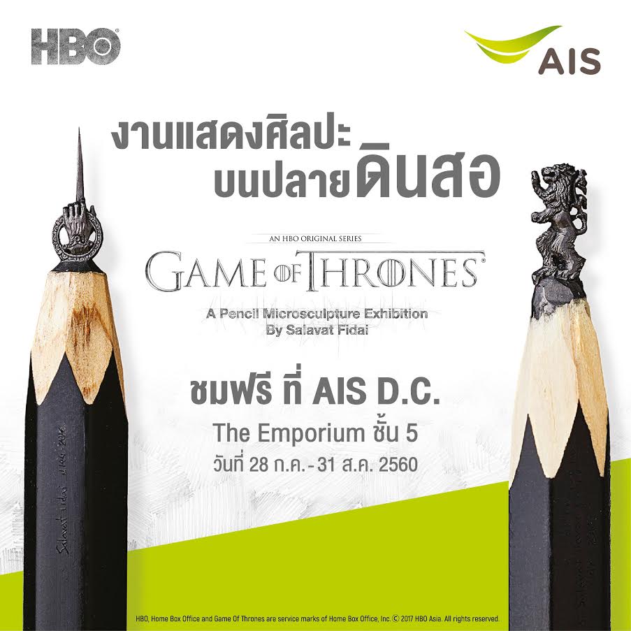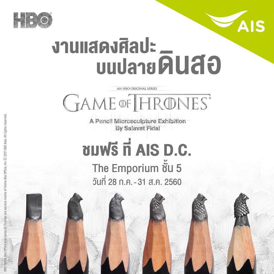 ล่าสุด AIS จับมือกับ HBO ASIA ต่อยอดประสบการณ์ความมันส์ให้กับแฟนๆ ชาวไทย ผู้ชื่นชอบซีรีส์ “Game of Thrones” นำสุดยอดงานศิลปะระดับโลก “Game of Thrones A Pencil Microsculpture Exhibition in Bangkok” (#GOTPencilArt) เข้ามาจัดแสดงในประเทศไทยเป็นครั้งแรก และครั้งเดียว พบกับผลงานแกะสลักประติมากรรมขนาดจิ๋ว ลงบนไส้ดินสอกราไฟต์ เป็นรูปสัญลักษณ์ และตัวละครจากซีรีส์ Game of Thrones โดย “ซาลาวัต ฟิได” ศิลปินชั้นนำชาวรัสเซีย ซึ่งเป็นที่ยอมรับทั่วโลกถึงฝีมือการแกะสลักงานศิลป์ขนาดย่อส่วน โดยเปิดให้ประชาชนทั่วไปเข้าชมฟรี! ตั้งแต่วันที่ 28 ก.ค. – 31 ส.ค. 60 ณ AIS D.C. ชั้น 5 ศูนย์การค้าดิเอ็มโพเรียม