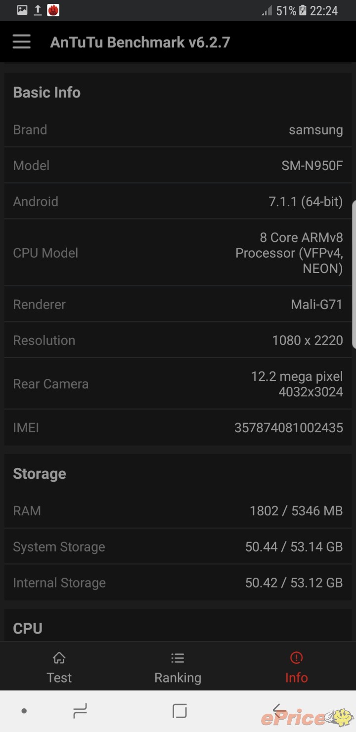 ข้อมูล Galaxy Note 8 จากแอพพลิเคชั่น AnTuTu