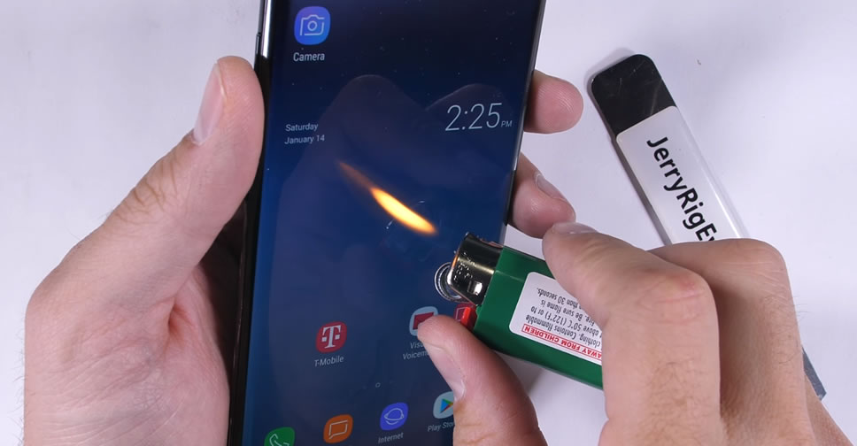 กลับมาที่จอแสดงผลกันอีกครั้ง Zack Nelson ได้ใช้ไฟแช็คเผาหน้าจอ เหมือนที่เขาเคยทำกับสมาร์ทโฟนทุกรุ่นที่เคยผ่านมือ และความร้อนของไฟก็ได้ทิ้งร่องรอยเอาไว้ด้วย