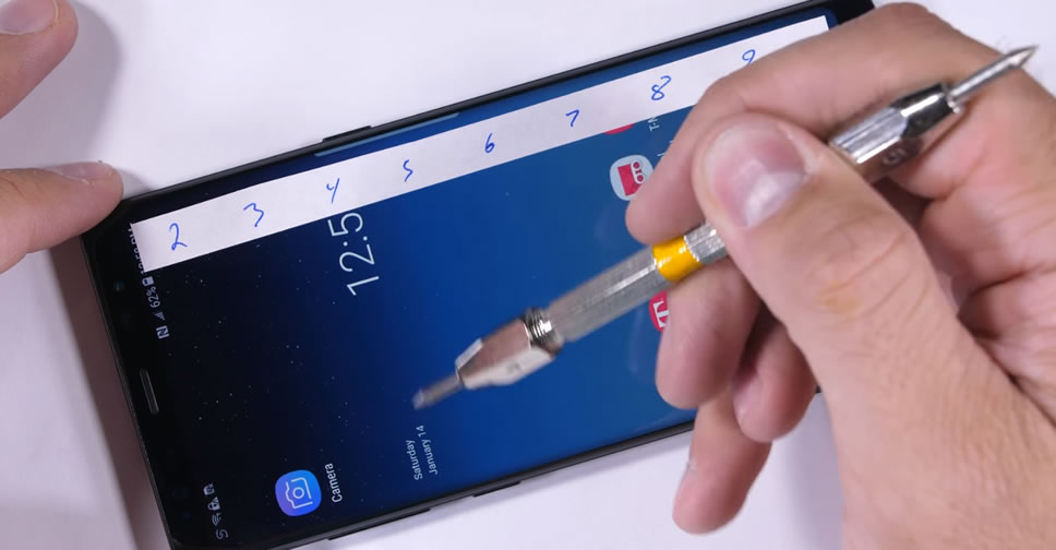 เริ่มจากทดสอบประสิทธิภาพในการป้องกันรอยขีดข่วนของจอแสดงผล ซึ่งได้ผลออกมาว่าจอแสดงผลของ Galaxy Note 8 ทนทานต่อการขีดข่วนในระดับ 6 ตามค่าความแข็งแบบโมห์สเกล และอยู่ระดับเดียวกับ Galaxy S8 เพราะใช้จอแสดงผลแบบเดียวกัน