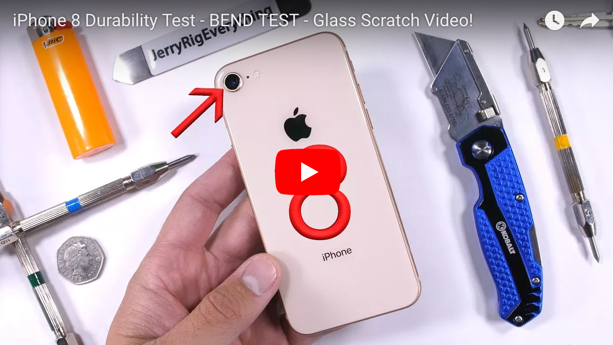 บอดี้ของ iPhone 8 ทนทานต่อรอยขีดข่วนมากขึ้น เนื่องจากมีการเปลี่ยนวัสดุมาใช้กระจกแทนอลูมิเนียม ทำให้แผงหลังและแผงกระจกด้านหน้า สามารถป้องกันรอยขีดข่วนจากใบมีด เหรียญโลหะ หรือแม้แต่กุญแจ แต่ขอบด้านข้างซึ่งใช้วัสดุสแตนเลสสตีล ยังไม่สามารถต้านทานความคมของใบมีดได้ และปิดท้ายด้วยการดัดสมาร์ทโฟนให้โค้งงอด้วยมือเปล่า ซึ่งเราจะเห็นได้จากวีดีโอด้านล่างว่า iPhone 8 แข็งแรงขนาดไหน