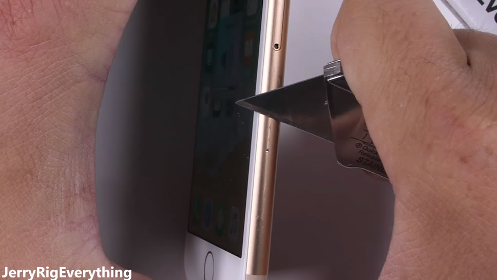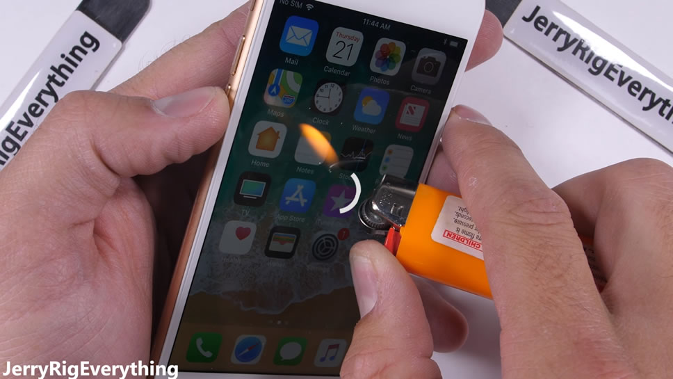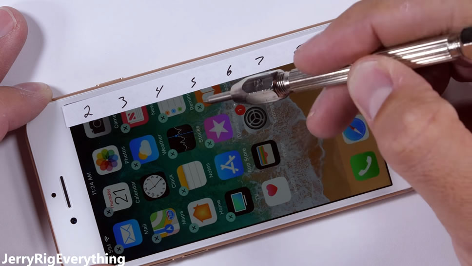 เมื่อ iPhone 8 มาอยู่ในมือของ Zack Nelson ก็ถูกทดสอบด้วยมาตรฐานเดียวกัน ซึ่งจอแสดงผลสามารถ ทนทานต่อการขีดข่วนในระดับ 6 ตามค่าความแข็งแบบโมห์สเกล ระดับเดียวกับเรือธงของ Samsung อย่าง Galaxy Note 8 และ Galaxy S8 อีกทั้งจอแสดงผลยังสามารถรักษาตัวเองได้ หลังจากถูกไฟลน