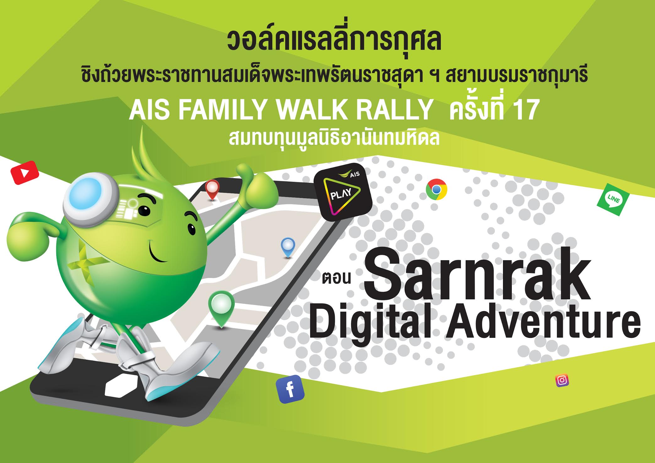 ได้เวลาความสุขและสนุกกันแบบสุดขีดอีกครั้ง กับกิจกรรมวันหยุดที่จะมาตอบโจทย์ไลฟ์สไตล์ของครอบครัวยุคดิจิทัล โดย คุณอมรรัตน์ ชาญปรีชญา ผู้อำนวยการส่วนงานประชาสัมพันธ์ภาพลักษณ์องค์กร บริษัท แอดวานซ์ อินโฟร์ เซอร์วิส จำกัด (มหาชน) หรือเอไอเอส ชวนทุกครอบครัวมาร่วมแบ่งปันช่วงเวลาแห่งความสุขในกิจกรรมการกุศล “เอไอเอส แฟมิลี่ วอล์ค แรลลี่” ครั้งที่ 17 ตอน “Sarnrak Digital Adventure” ชิงถ้วยพระราชทานสมเด็จพระเทพรัตนราชสุดา ฯ สยามบรมราชกุมารี เพื่อนำรายได้สมทบทุนมูลนิธิอานันทมหิดล โดยการแข่งขันจะจัดขึ้นในวันเสาร์ที่ 25 พฤศจิกายน 2560 ณ สามพราน ริเวอร์ไซด์ จังหวัดนครปฐม