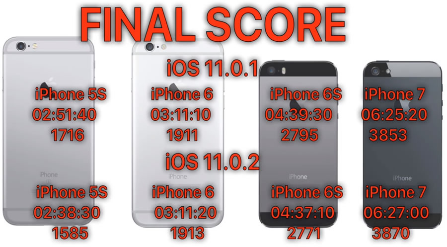iAppleBytes นำ iPhone 7, 6s, 6 และ 5s มาทดสอบประสิทธิภาพของแบตเตอรี่ด้วยแอพพลิเคชั่น Geekbench โดยทดสอบทั้งเวอร์ชั่น iOS 11.0.2 และ iOS 11.0.1 เพื่อนำตัวเลขมาเปรียบเทียบกัน