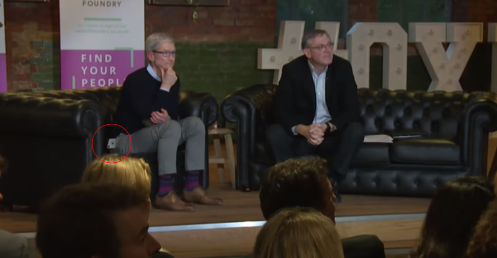 iPhone X ค่อยๆ เลื่อนออกจากกระเป๋ากางเกงของ Tim Cook จนหล่นออกมา โชคดีที่มันตกลงบนโซฟาที่เขานั่งอยู่ Tim Cook รู้ตัวเกือบจะทันที และดูเหมือนเขาไม่ซีเรียสกับเรื่องนี้ Tim Cook ก้มลงดูเล็กน้อย ก่อนจะจับ iPhone X ให้คว่ำลง แล้วให้สัมภาษณ์ต่อไป