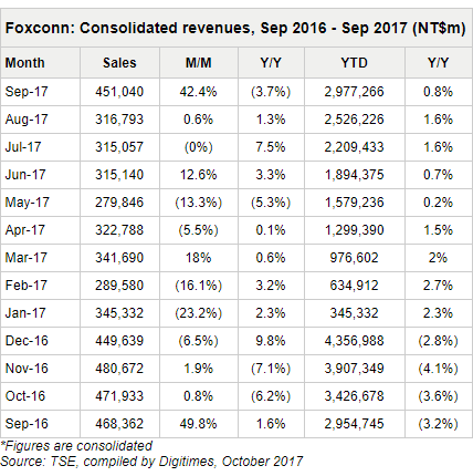 ถึงแม้ Apple จะไม่ใช่ลูกค้าเพียงรายเดียวของ Foxconn แต่รายได้ที่เติบโตขึ้นอย่างชัดเจนในเดือนกันยายน เป็นช่วงเดียวกับที่ iPhone 8 เปิดตัวทางการ แหล่งข่าวจึงเชื่อว่า การได้รับคำสั่งซื้อให้ผลิต iPhone 8 เป็นส่วนสำคัญที่ทำให้ Foxconn มีรายได้เพิ่มขึ้นในเดือนนี้