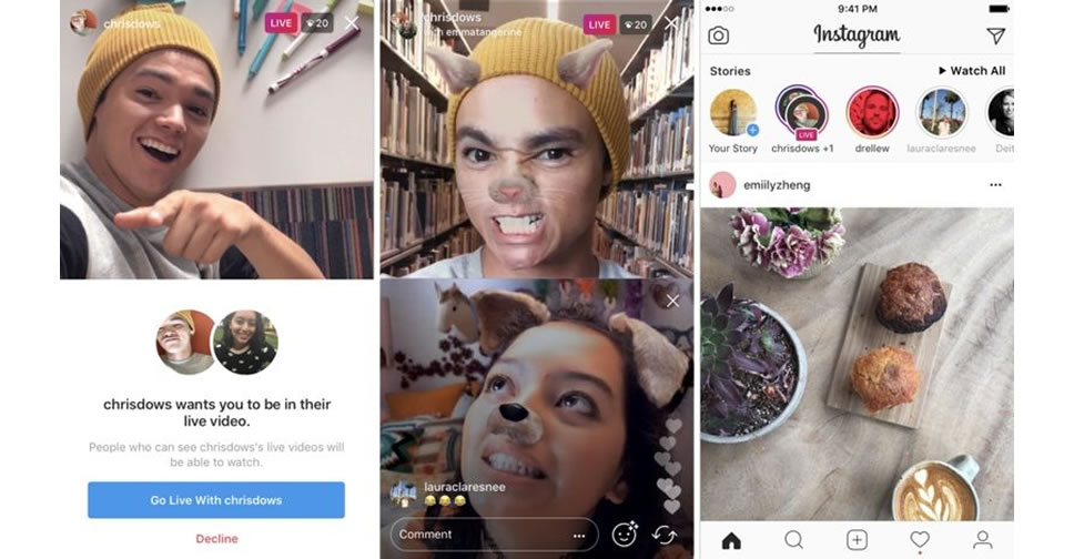 แอพพลิเคชั่น Instagram อัพเดทเวอร์ชั่นใหม่เมื่อวันที่ 24 ตุลาคมที่ผ่านมา ทั้งอุปกรณ์ iOS และ Android โดยเพิ่มความสามารถให้ผู้ใช้งานสามารถ Live วีดีโอ และดึงเพื่อนหรือผู้ที่กำลังรับชมเข้ามาร่วม Live บนหน้าจอเดียวกัน โดยแบ่งออกเป็น 2 หน้าต่าง และสามารถลบเพื่อนออกไปหรือเปลี่ยนเป็นเพื่อนคนอื่นให้มาร่วม Live ได้