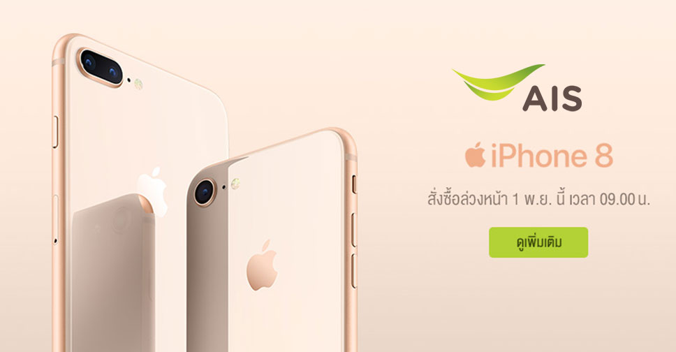 AIS ประกาศในวันนี้ว่าจะวางจำหน่าย iPhone 8 และ iPhone 8 Plus ซึ่งเป็นเจเนอเรชั่นใหม่ของ iPhone โดยลูกค้าสามารถสั่งจอง iPhone 8 และ iPhone 8 Plus ได้ในวันที่ 1 พฤศจิกายน 2560 เวลา 9.00 น.ผ่านทาง www.ais.co.th/iphone8 และจะวางจำหน่ายที่เอไอเอส ช็อป ทุกสาขา, ร้านเทเลวิซที่ร่วมรายการทั่วประเทศ, ร้าน iStudio และ AIS Online Store ตั้งแต่วันที่ 3 พฤศจิกายน 2560