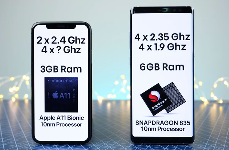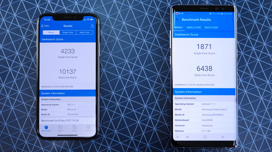 จากการเปิดเกมและแอพพลิเคชั่นเดียวกันทั้งหมด 17 แอพ พบว่า iPhone X ทำเวลาได้ 2.47 นาที ในรอบแรก และ 1.05 นาที ในรอบที่สอง ขณะที่ Galaxy Note 8 ทำเวลาได้ 4.46 นาที ในรอบแรก และ 0.38 นาที ในรอบที่สอง นอกจากนี้ EverythingApplePro ยังเผยผลทดสอบจากแอพพลิเคชั่น Geekbench และ AnTuTu ให้ได้ดูกันด้วย