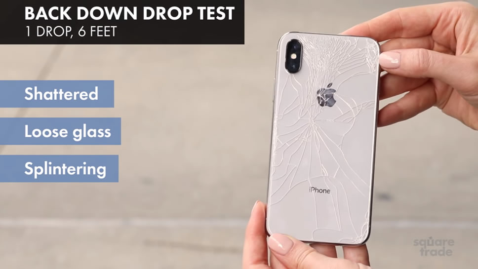 SquareTrade เริ่มปล่อย iPhone X ในครั้งแรกโดยให้ด้านข้างหล่นลงมาก่อน และพบว่าจอแสดงผลทำงานผิดปกติทันที และขอบด้านข้างก็เริ่มแตกร้าว ครั้งที่ 2 ได้ปล่อยให้แผงหน้าจอหล่นลงมาก่อน และพบว่าจอแสดงผลแตกละเอียดทันที Face ID ทำงานล้มเหลว ครั้งที่ 3 ได้ปล่อยให้แผงหลังลงมาสู่พื้น ซึ่งกระจกด้านหลังก็แตกร้าวอย่างชัดเจน