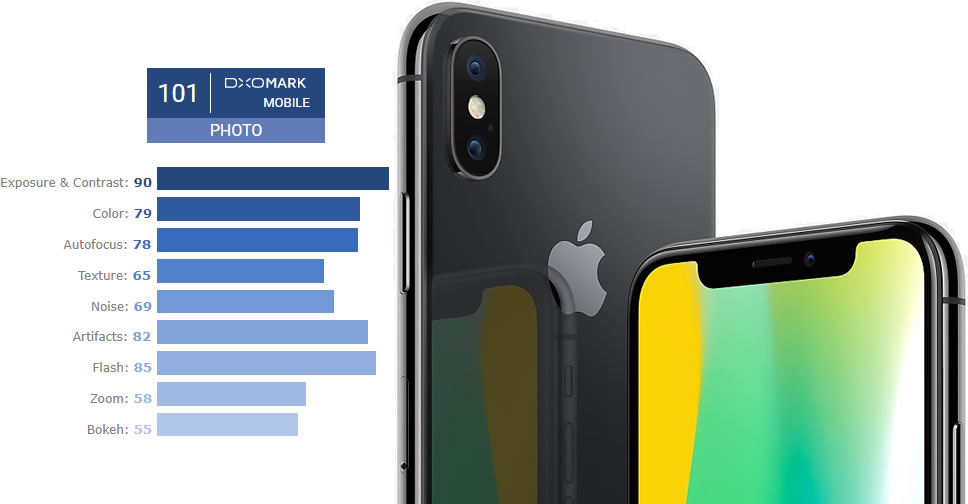DxOMark ผู้เชี่ยวชาญด้านการทดสอบกล้อง ได้นำ iPhone X มาทดสอบแล้ว และยกให้ iPhone X เป็นสมาร์ทโฟนที่ถ่ายภาพนิ่งได้ดีที่สุดเท่าที่เคยทดสอบมา ทำได้ถึง 101 คะแนน ขณะที่ Huawei Mate 10 Pro และ Samsung Galaxy Note 8 ได้รับ 100 คะแนนเท่านั้น