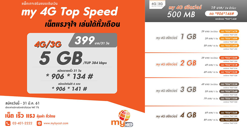 ใครถูกใจแพ็กเกจไหน ก็เลือกให้เหมาะกับการใช้งานได้เลย mybyCAT พร้อมให้คุณสัมผัสประสบการณ์ เร็ว แรง ทั่วประเทศแล้ววันนี้…สามารถสมัครใช้บริการได้ตั้งแต่วันนี้ ถึง 31 มีนาคม 2561 ดูรายละเอียดแพ็กเกจ 4G เพิ่มเติมได้ที่ www.mybycat.com หรือ สอบถาม Call Center 02-401-2222