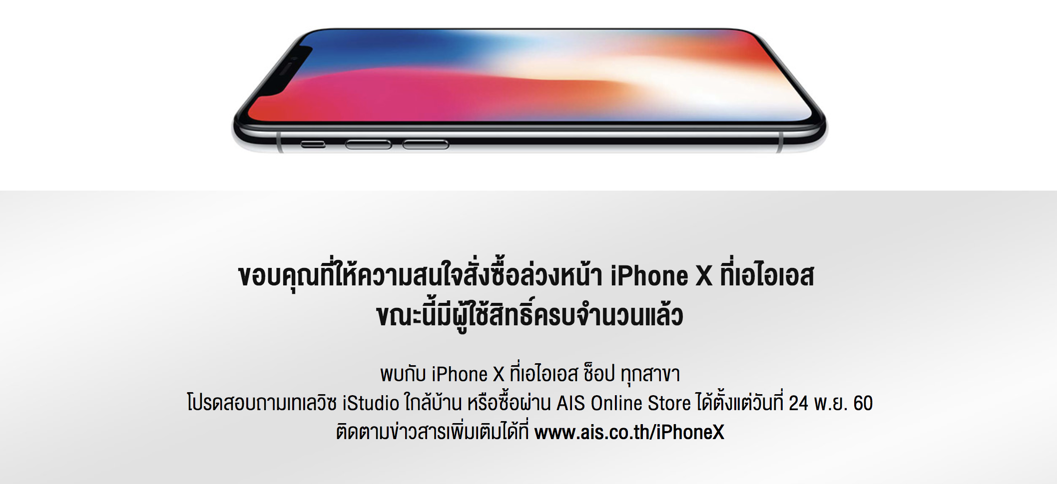 “ขอบคุณที่ให้ความสนใจสั่งซื้อล่วงหน้า iPhone X ที่เอไอเอส ขณะนี้มีผู้ใช้สิทธิ์ครบจำนวนแล้ว พบกับ iPhone X ที่เอไอเอส ช็อป ทุกสาขา โปรดสอบถามเทเลวิซ iStudio ใกล้บ้าน หรือซื้อผ่าน AIS Online Store ได้ตั้งแต่วันที่ 24 พ.ย. 60 ติดตามข่าวสารเพิ่มเติมได้ที่ www.ais.co.th/iPhoneX ”
