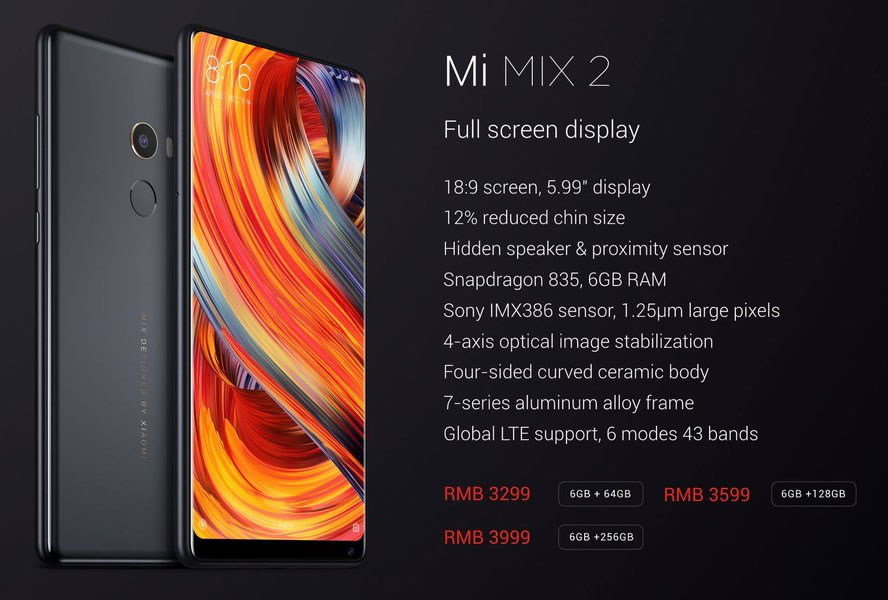 Xiaomi แนะนำสมาร์ทโฟนดีไซน์ไร้กรอบ Mi Mix 2 ครั้งแรกในเดือนกันยายนที่ผ่านมา โดยผลิตออกมา 2 แบบ คือ เซรามิคผสานกรอบอลูมิเนียมอัลลอย กับแบบเซรามิคอย่างเต็มรูปแบบ ในเวอร์ชั่นที่ใช้กรอบอลูมิเนียมอัลลอย มากับ RAM 6GB ความจุในตัวสูงสุด 256GB ส่วนเวอร์ชั่นเซรามิค จะมากับ RAM 8GB และความจุในตัว 128GB