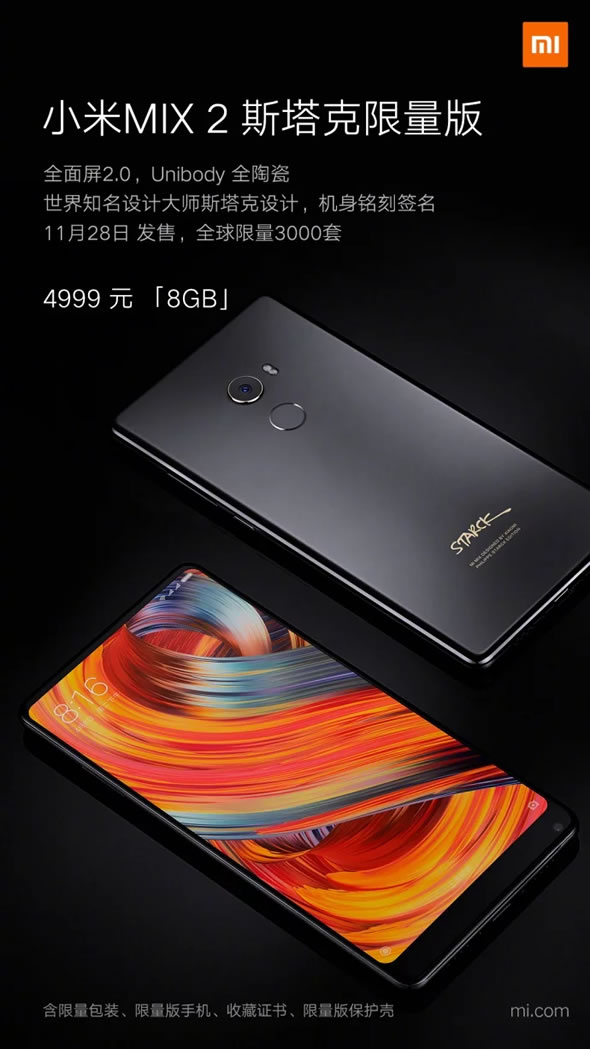 ทั้งนี้ Mi Mix 2 Starck Edition จะมาพร้อมลายเซ็นต์ Starck ที่ด้านหลัง ซึ่งเป็นชื่อของ Philippe Starck ดีไซเนอร์ชาวฝรั่งเศส ผู้ออกแบบสมาร์ทโฟน Mi Mix ตั้งแต่รุ่นแรก