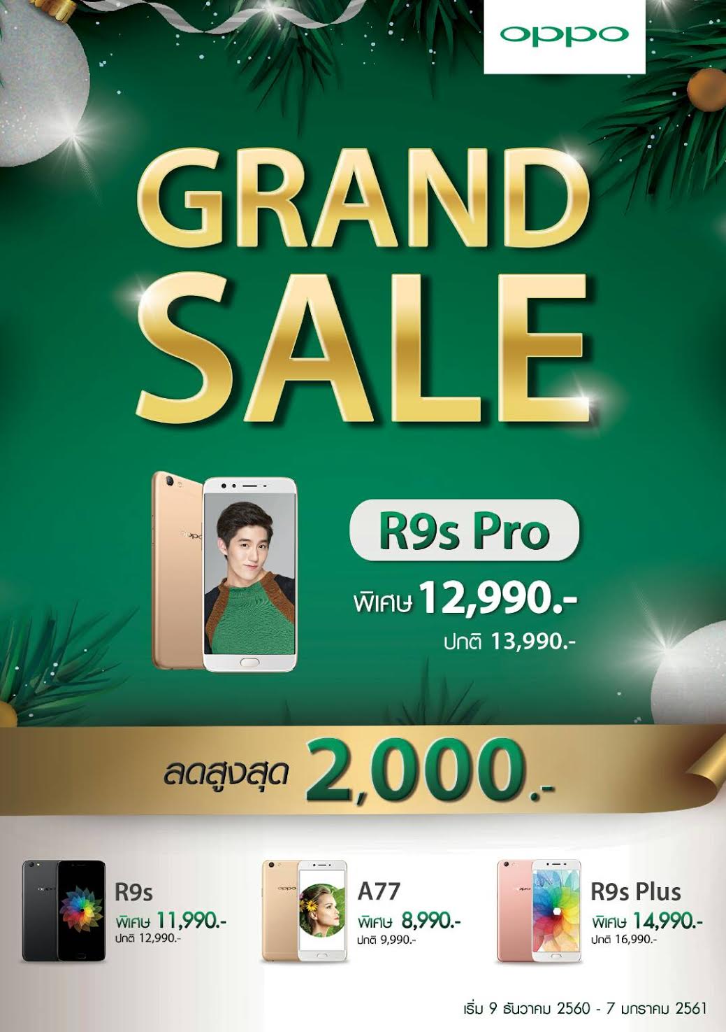 OPPO ใจดีอีกแล้ว กับโปรโมชั่นส่งท้ายปี OPPO Grand Sale ที่มอบส่วนลดค่าเครื่องสูงสุดถึง 2,000 บาท ไม่ว่าจะเป็นรุ่น OPPO R9s Pro สมาร์ทโฟนกล้องหน้าคู่ ที่ถ่ายภาพแบบกรุ๊ปฟี่ (Groupfie) ในมุมมองกว้างถึง 120 องศา OPPO R9s Plus ที่มาพร้อมหน้าจอที่กว้างขึ้นถึง 6 นิ้ว และแรม 6GB ที่ช่วยให้เร็วแรงไม่มีสะดุด OPPO R9s ที่มาพร้อมสโลแกน Now It’s Clear ที่จะทำให้ทุกภาพคมชัดทุกรายละเอียดกว่าที่เคย และ OPPO A77 ที่มาพร้อมโหมดโบเก้ ที่จะช่วยให้การถ่ายภาพหน้าชัดหลังเบลอไม่ยากอีกต่อไป