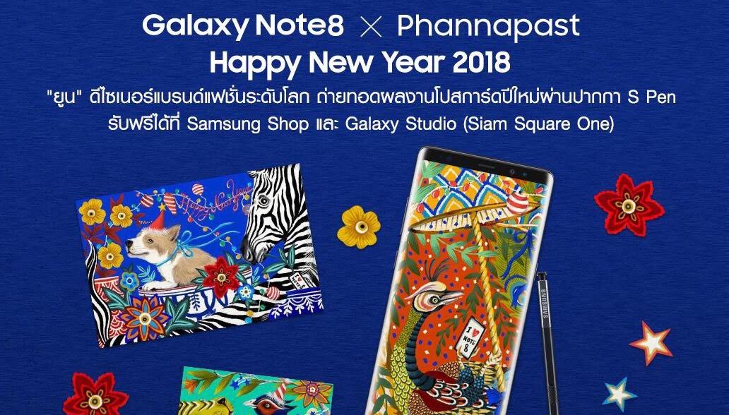 นอกจากนี้ ซัมซุงยังแจกฟรี! โปสการ์ดอวยพรที่ออกแบบมาพิเศษเพื่อเทศกาลปีใหม่นี้โดยคุณ “ยูน-ปัณพัท เตชเมธากุล” ดีไซเนอร์แบรนด์แฟชั่นระดับโลก ผ่านปากกา S Pen ตามแนวคิด ’Galaxy in the Bush’ ที่ได้รับแรงบันดาลใจจากการผสมผสานศิลปะตะวันตกและตะวันออกและเพิ่มความสนุกสนานด้วยหมวกปีใหม่ ดวงไฟ และดาวประดับ ใน 4 แบบ 4 ลายสุดเก๋ พร้อมเพิ่มดีกรีแห่งความสุขด้วยโปรโมชั่นสุดร้อนแรงส่งท้ายปีสำหรับผู้ที่สนใจอยากเป็นเจ้าของสมาร์ทโฟน ซัมซุง กาแลคซี่ โน้ต 8, ซัมซุง กาแลคซี่ เอส 8/เอส 8 พลัส และซัมซุง กาแลคซี่ โน้ต แฟน เอดิชั่น สามารถรับส่วนลดเพิ่มอีก 2,000 บาท จากทุกโปรโมชั่น และลูกค้าซัมซุงยังจะได้รับสินค้าที่ซื้อในช่วงเดือนธันวาคมในถุงเฟสทีฟสีน้ำเงินสุดเก๋ต้อนรับเทศกาลปีใหม่ เข้ากับการตกแต่งหน้าร้านของซัมซุงที่แสดงถึงความสนุกรื่นเริงในช่วงเวลาแห่งความสุขประจำปี โดยลูกค้าสามารถรับโปสการ์ดอวยพรและถุงสีน้ำเงินสุดพิเศษได้ที่ ซัมซุง แบรนด์ ช็อป ที่ร่วมรายการ และที่กาแลคซี่ สตูดิโอ สยาม สแควร์ วัน ตั้งแต่วันนี้ – 31 ธันวาคม 2560 เท่านั้น