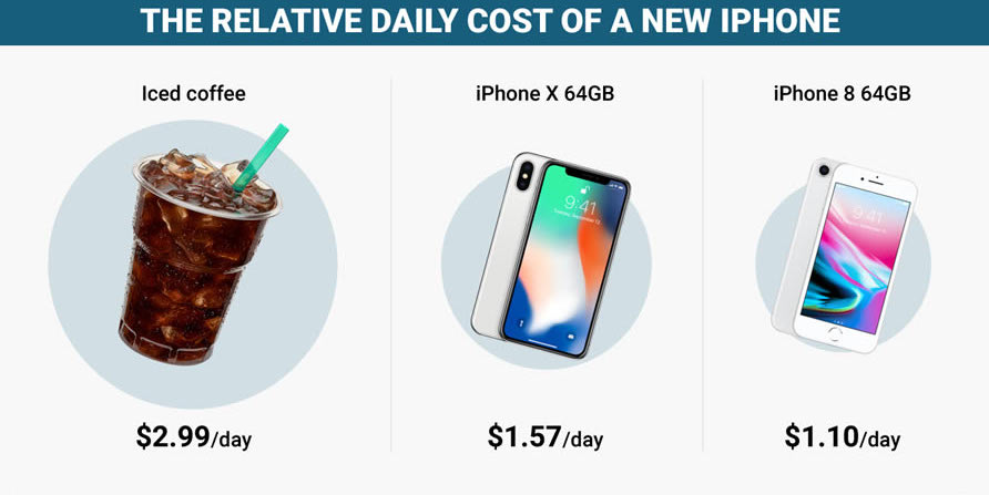 Tim Cook ซีอีโอของ Apple เคยกล่าวเอาไว้ว่า iPhone X มีราคาถูกกว่ากาแฟจากร้านดีๆ หากคิดเป็นมูลค่ารายวัน และจากการคำนวณของ BusinessInsider ก็พบว่า Tim Cook กล่าวเอาไว้อย่างถูกต้อง โดยเฉลี่ยแล้วผู้ใช้สมาร์ทโฟนในสหรัฐอเมริกา จะใช้งาน iPhone นาน 22.7 เดือน หรือ 690 วัน จึงมีการอัพเกรดเป็นรุ่นใหม่