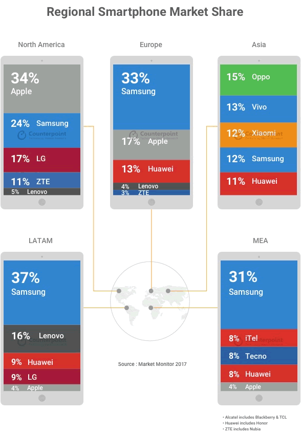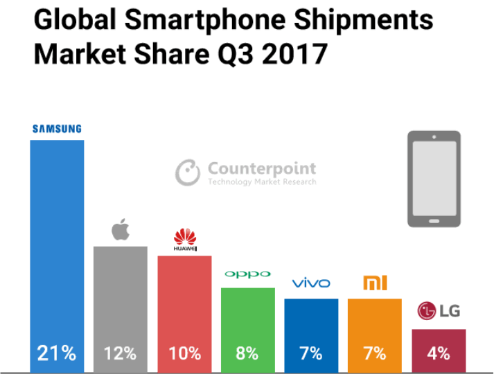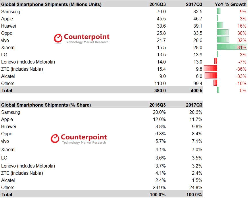 บริษัทวิจัยตลาด Counterpoint รายงานการจัดส่งสมาร์ทโฟนทั่วโลก ในช่วงไตรมาสที่ 3 (กรกฎาคม – กันยายน) ปี 2017 พบยอดจัดส่งสมาร์ทโฟนเติบโตขึ้น 9% เมื่อเทียบกับไตรมาสที่ 2 และ เติบโต 5% เมื่อเทียบกับไตรมาสเดียวกันของปี 2016 โดยแบรนด์สมาร์ทโฟนที่อยู่ใน 10 อันดับบนสุด ร่วมกันครองส่วนแบ่ง 3 ใน 4 จากยอดจัดส่งทั่วโลก