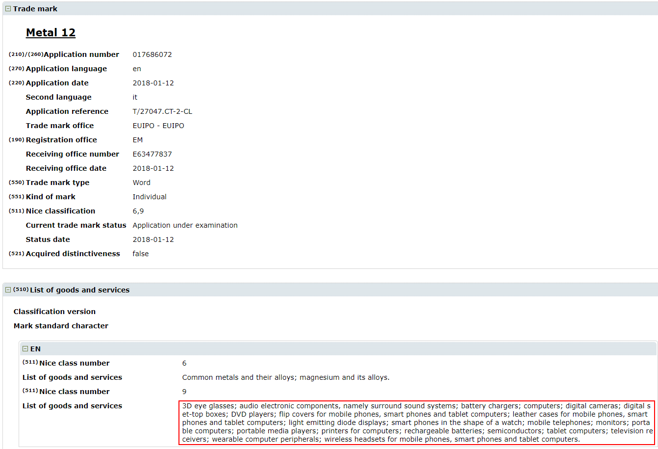 Samsung จดเครื่องหมายการค้า Metal 12 กับทางสำนักงานทรัพย์สินทางปัญญาของสหภาพยุโรป (European Union Intellectual Property Office) เพื่อนำมาใช้กับผลิตภัณฑ์ที่หลากหลายของตัวเอง รวมถึงสมาร์ทโฟน และอุปกรณ์สวมใส่ ที่จะออกมาในอนาคต