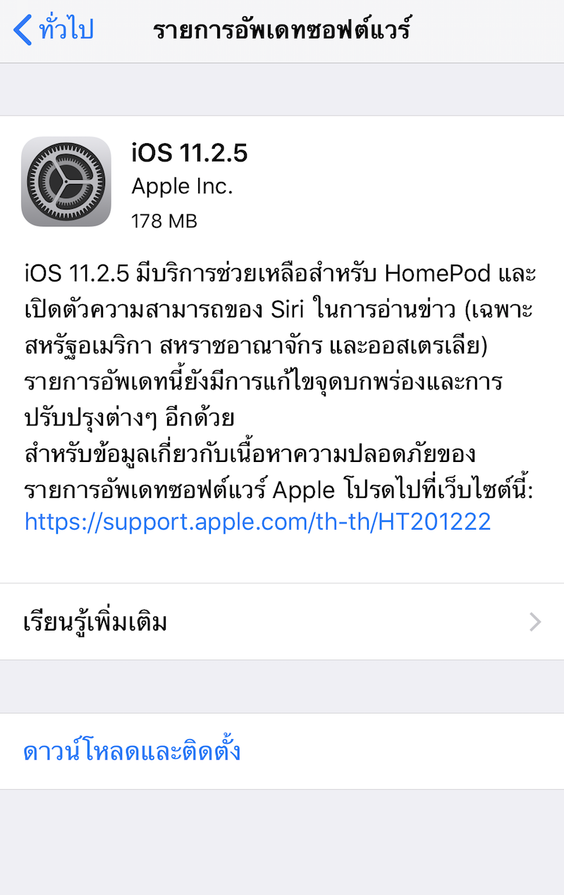 วันนี้ Apple ได้ปล่อย iOS 11.2.5 ตัวเต็มสำหรับผู้ใช้งาน iPhone ,iPad และ iPod Touch ทั่วไปออกมาอย่างเป็นทางการแล้ว หลังจากที่เปิดให้เหล่านักพัฒนาและกลุ่มผู้ที่สนใจลงทะเบียนทดลองใช้งานมาก่อนหน้า ซึ่งในเวอร์ชั่นใหม่นี้มีบริการช่วยเหลือสำหรับ HomePod และเปิดตัวความสามารถของ Siri ในการอ่านข่าว (เฉพาะสหรัฐอเมริกา สหราชอาณาจักร และออสเตรเลีย) รายการอัพเดทนี้ยังมีการแก้ไขจุดบกพร่องและการปรับปรุงต่างๆ อีกด้วยดังนี้