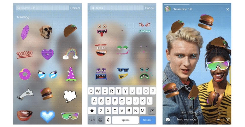 แอพพลิเคชั่น Instagram เวอร์ชั่นใหม่ ได้เพิ่มปุ่ม GIF ลงใน Stories สำหรับแทรกสติกเกอร์แบบเคลื่อนไหวได้ ลงบนภาพถ่ายหรือวีดีโอ และยังสามารถเลือกสติกเกอร์ GIF ที่กำลังได้รับความนิยมใน GIPHY ได้อีกด้วย หรือจะพิมพ์ค้นหาสติกเกอร์ GIF แบบเฉพาะเจาะจงจากคลัง GIPHY ได้เช่นกัน โดยฟีเจอร์สติกเกอร์ GIF พร้อมให้ใช้งานได้ทันที