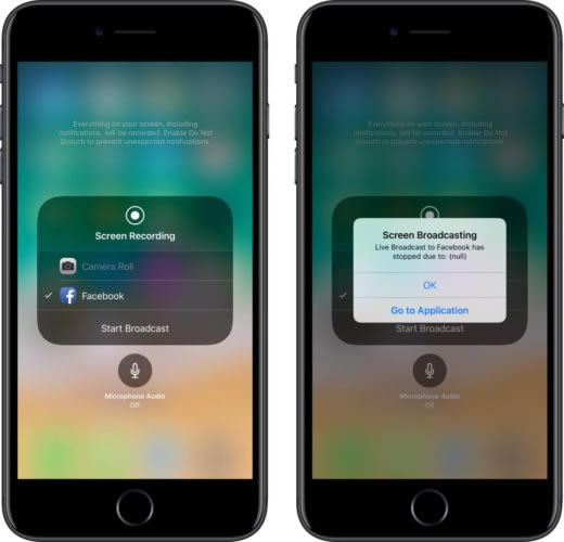 แอพพลิเคชั่น Facebook สามารถทำงานร่วมกับฟีเจอร์ Screen Recording ของ iOS 11 แล้ว โดยจะพบแอพ Facebook อยู่ในวิดเจ็ต Screen Recording เมื่อเข้าถึงจาก Control Center โดยการการแตะด้วย 3D Touch อย่างไรก็ตาม เมื่อลองแตะปุ่ม Start Broadcast กลับพบข้อความแสดงความผิดพลาด ซึ่งหมายถึงยังไม่สามารถใช้งานฟีเจอร์นี้ได้ในปัจจุบันนี้