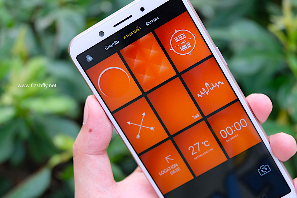 รวมถึงสามารถตั้งเวลานับถอยหลังถ่าย 3 วินาที 10 วินาที รวมเลือกแตะหน้าจอเพื่อถ่าย หรือชูผ่ามือทั้ง 5 นิ้วเพื่อให้กล้องนับถอยหลังเพื่อถ่ายก็ได้ มีฟิลเตอร์และลายน้ำให้เลือกใช้ 8 แบบ สามารถเลือกปรับสัดส่วนภาพได้ทันทีมี 3 แบบคือมาตรฐาน ,จตุรัส และแบบเต็มหน้าจอ