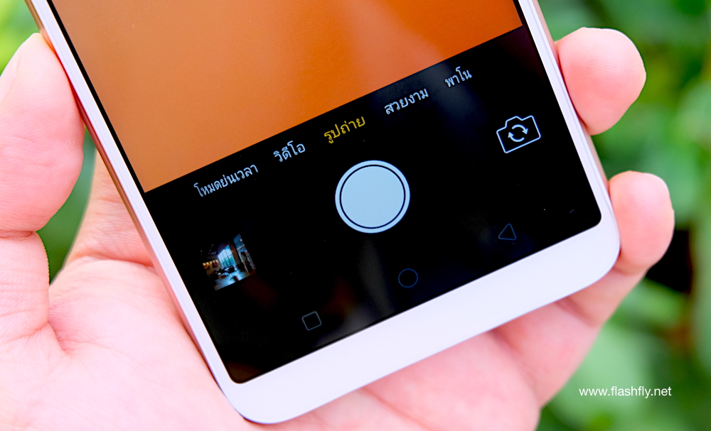 ด้านหลังติดตั้งกล้อง 13 ล้านพิกเซลไว้ที่มุมบนขวา วางคู่กับแฟลช LED ส่วนขอบกันชนเลนส์กล้องจะนูนขึ้นมาเล็กน้อย แต่ไม่ต้องห่วง เพราะในกล่องแถมเคสมาให้ด้วยแล้ว และภายใต้แผงหลังที่แกะไม่ได้ มาพร้อมกับแบตเตอรี่ความจุ 3,180mAh