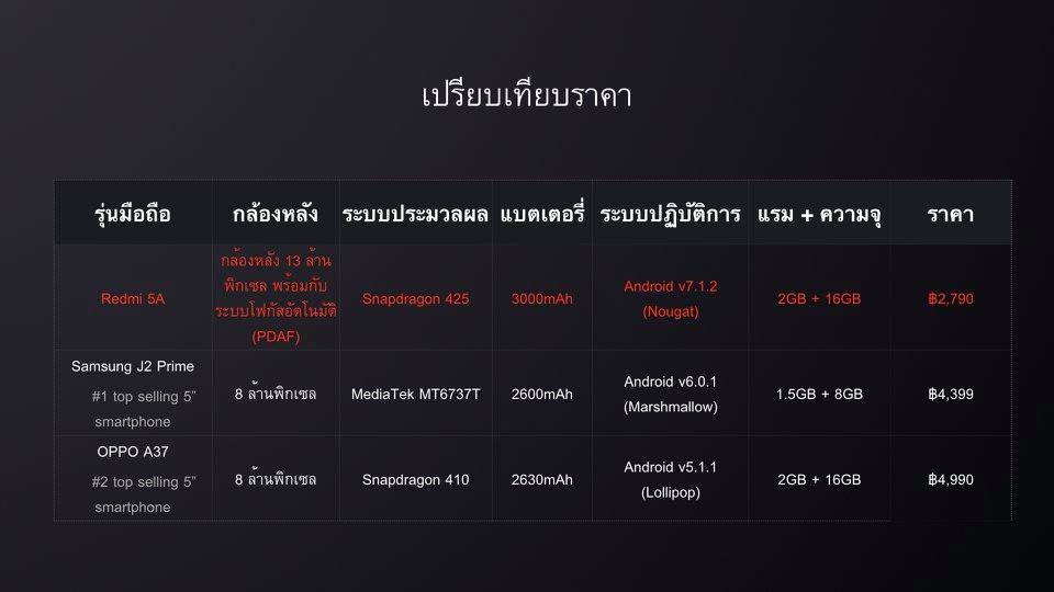 มาพร้อมหน้าจอขนาด 5 ความละเอียด HD ชิปเซ็ต Snapdragon 425 แรม 2GB หน่วยความจำภายใน 16GB เพิ่มได้ 128GB แบตเตอรี่ 3,000mAh กล้องดิจิตอลความละเอียด 13 ล้านพิกเซล ระบบออโต้โฟกัส PDAF กล้องหน้าความละเอียด 5 ล้านพิกเซล ระบบปฎิบัติการ MIUI 9 (Android 7.1.2) ในราคาเพียง 2,790 บาท ถือได้ว่าทำราคาได้ถูกที่สุดในตลาดเวลานี้