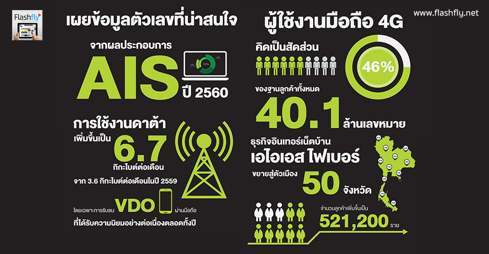 นายสมชัย เลิศสุทธิวงค์ ประธานเจ้าหน้าที่บริหาร บริษัท แอดวานซ์ อินโฟร์ เซอร์วิส จำกัด (มหาชน) หรือ เอไอเอส กล่าวว่า “ปี 2560 ที่ผ่านมา เอไอเอสยังคงพัฒนาเครือข่ายและการบริการ เพื่อรองรับความต้องการของผู้บริโภคในยุคดิจิทัลอย่างต่อเนื่อง ทั้งด้านบริการโทรศัพท์เคลื่อนที่ อินเทอร์เน็ตบ้าน และดิจิทัลคอนเทนต์ โดยภาพรวมผลประกอบการของทั้งปี รายได้รวมเติบโต 3.7% จากปีก่อน เป็นผลจากแนวโน้มการใช้งานดาต้าที่เพิ่มขึ้นจาก 3.6 กิกะไบต์ต่อเดือน ในปี 2559 เป็น 6.7 กิกะไบต์ต่อเดือนในปี 2560 มีผลมาจากการรับชมวีดีโอผ่านมือถือที่ได้รับความนิยมอย่างสูง และมีผู้ใช้งานมือถือ 4G คิดเป็นสัดส่วน 46% ของฐานลูกค้าทั้งหมด 40.1 ล้านเลขหมาย สำหรับธุรกิจอินเทอร์เน็ตบ้าน เอไอเอส ไฟเบอร์ ได้ขยายบริการครอบคลุมในหัวเมืองสำคัญต่างๆ รวม 50 จังหวัด และมีฐานลูกค้าเพิ่มขึ้นเป็น 521,200 ราย ส่วนดิจิทัลคอนเทนต์ เอไอเอสได้ออกแพ็คเก็จพรีเมียมคอนเทนต์ใหม่ เพื่อตอบโจทย์ไลฟ์สไตล์ของลูกค้า อาทิ กีฬา ภาพยนตร์ และครอบครัว โดยสามารถรับชมได้อย่างสะดวกสบาย ผ่านแอป AIS PLAY บนมือถือ และ AIS PLAYBOX ทางทีวี ทั้งนี้ เอไอเอสมีรายได้ก่อนหักภาษี ดอกเบี้ย และค่าเสื่อม (EBITDA) เพิ่มขึ้น 16% เป็น 70,498 ล้านบาท จากการเติบโตของรายได้และการควบคุมต้นทุน อย่างไรก็ตาม กำไรสุทธิปรับตัวลง 1.9% อยู่ที่ 30,077 ล้านบาท จากการลงทุนโครงข่าย 4G ต่อเนื่อง และค่าใบอนุญาตคลื่นความถี่