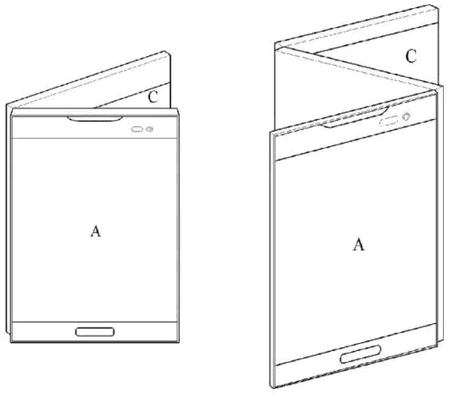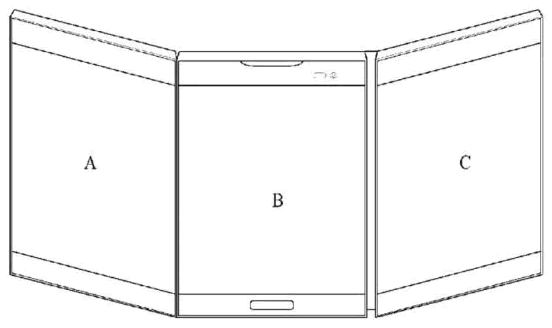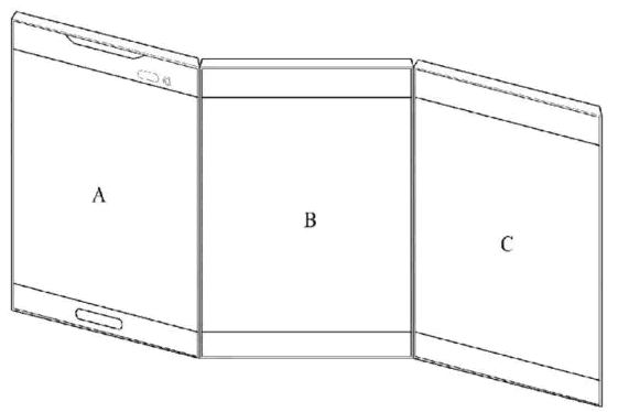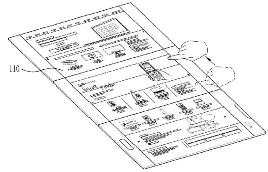 สิทธิบัตรฉบับนี้ แสดงให้เห็นการออกแบบของสมาร์ทโฟนพับได้แบบ 3 หน้าจอ คล้ายกับแผ่นพับหรือโบรชัวร์ โดยสามารถใช้งานได้ในแบบหน้าจอเดียวเหมือนสมาร์ทโฟนทั่วไป หรือกางออกมาทั้ง 3 หน้าจอ เพื่อใช้งานในรูปแบบแท็บเล็ต