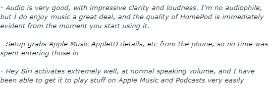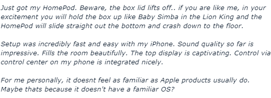 สมาชิกเว็บไซต์ Reddit อีกรายหนึ่งบอกว่า HomePod ให้เสียงที่น่าประทับใจและดังชัด เขาไม่ใช่นักฟังเพลงระดับ Audiophile แต่ชอบฟังเพลงมาก และคุณภาพของ HomePod ก็เด่นชัดทันทีตั้งแต่เริ่มใช้งาน การใช้งาน Siri ก็ทำได้ดี สามารถสั่งการด้วยระดับเสียงปกติ