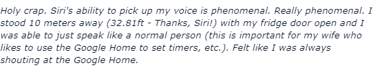ghostinthelatrine สมาชิกเว็บไซต์ Reddit ซึ่งเป็นชุมชนออนไลน์ที่ได้รับความนิยมอย่างมาก เขาประทับใจกับ Siri ใน HomePod ที่ได้ยินเสียงของเขา แม้เขาจะอยู่ห่างไปถึง 10 เมตร และพูดด้วยระดับเสียงปกติ (HomePod ติดตั้งไมโครโฟนมาให้ถึง 6 ตัว พร้อมระบบตัดเสียงสะท้อน) แตกต่างจาก Google Home ที่ภรรยาของเขาใช้ เพราะเหมือนภรรยาต้องตะโกนใส่ Google Hom ทุกครั้งที่ตั้งเวลา