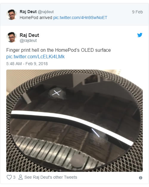 เจ้าของบัญชี Twitter @rajdeut บ่นเรื่องพื้นผิวด้านบนของ HomePod เป็นรอยนิ้วมือง่าย