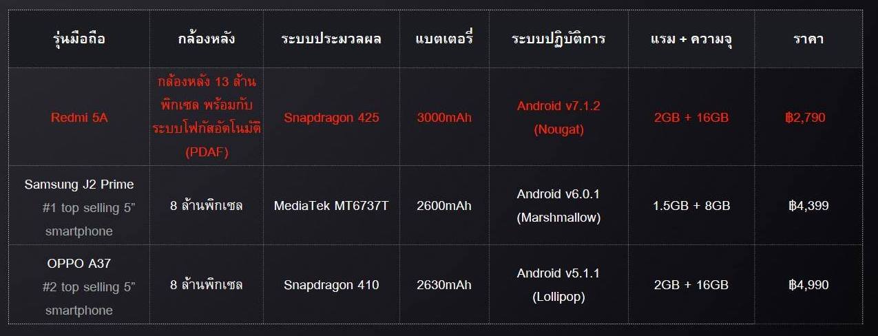 สเปกที่มีอยู่ใน Xiaomi Redmi 5A เทียบได้กับสมาร์ทโฟนในตลาดที่มีราคาแพงกว่าเกือบ 2 เท่า โดยเฉพาะชิปประมวลผลที่เป็นรุ่นใหม่กว่า ความจุแบตเตอรี่ที่มากกว่า และความละเอียดของกล้องดิจิตอล