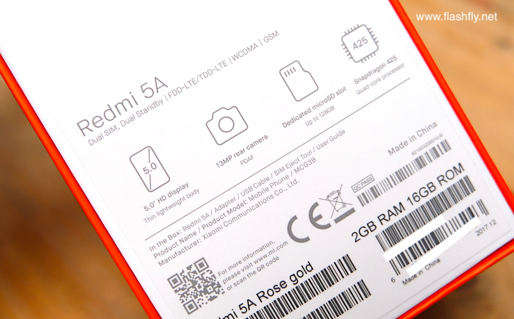 ด้านหลังกล่องระบุสเปกเพิ่มเติมของรุ่นนี้เอาไว้นั่นก็คือหน้าจอ 5 นิ้วความละเอียด HD ตัวเครื่องดีไซน์บางเบา กล้องดิจิตอลด้านหลังความละเอียด 13 ล้านพิกเซล พร้อมโฟกัสแบบ PDAF รองรับ MicroSD สูงสุด 128GB ชิปเซ็ต Snapdragon 425 นอกจากนี้ยังบอกอุปกรณ์ที่อยู่ภายในชุดจำหน่าย ด้านล่างจะบอกสีตัวเครื่อง และ RAM 2GB+ROM 16GB