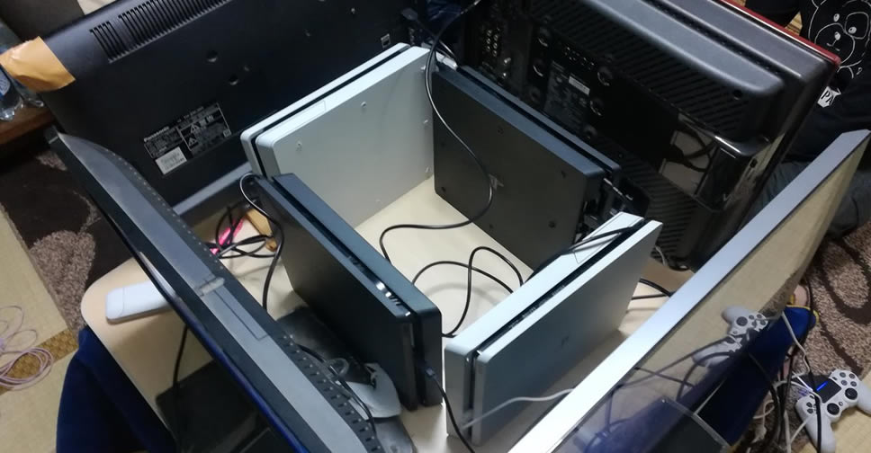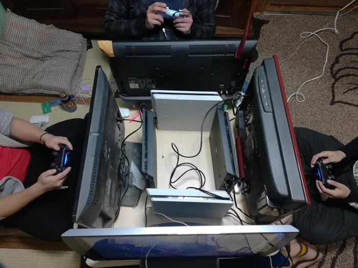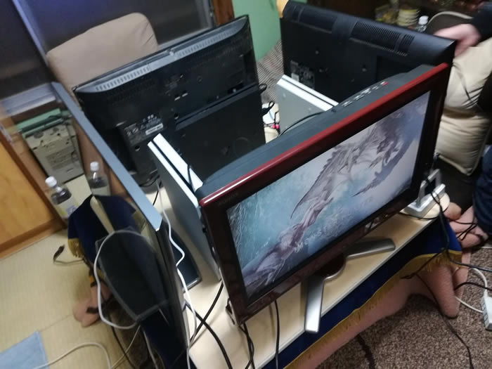 เจ้าของบัญชี Twitter @marutirun ได้แชร์ภาพการเล่นเกม Monster Hunter: World ในโหมด Multiplayer พร้อมกับเพื่อนอีก 3 คน โดยการตั้งจอทีวีและคอนโซล PS4 ทั้ง 4 เครื่อง ไว้บนโต๊ะเดียวกัน เพื่อที่จะช่วยเหลือและวางแผนการเล่นกับเพื่อนๆ ได้อย่างสะดวก