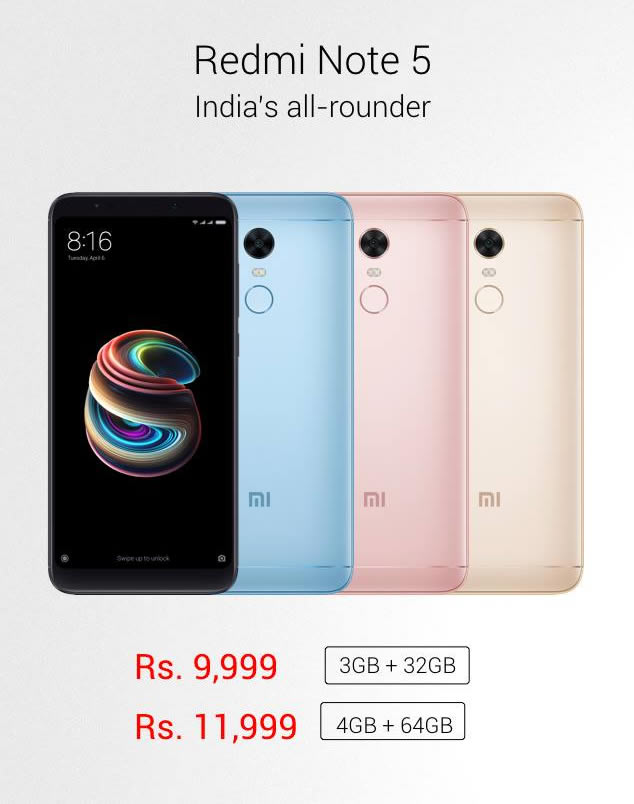 Xiaomi Redmi Note 5 ใช้ชิปประมวลผล Qualcomm Snapdragon 625 กล้องดิจิตอล 12 ล้านพิกเซล กล้องเซลฟี่ 5 ล้านพิกเซล ราคา 9,999 รูปี หรือราว 4,900 บาท สำหรับรุ่น RAM 3GB + ROM 32GB และราคา 11,999 รูปี หรือราว 5,900 บาท สำหรับรุ่น RAM 4GB + ROM 64GB