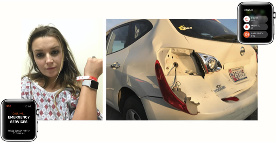 หลังจากรถยนต์ถูกชน ศีรษะของ Kacie Anderson ได้รับแรงกระแทกที่รุนแรง จนเธอไม่สามารถมองเห็นอะไรได้ชัดเจน และดูเหมือนทุกอย่างจะเป็นสีดำ ข้าวของในรถกระจัดกระจาย เธอไม่สามารถหา iPhone เพื่อโทรขอความช่วยเหลือได้ แต่ทันใดนั้นเธอก็ตระหนักได้ว่าที่ข้อมือได้สวม Apple Watch เอาไว้ จึงใช้ฟีเจอร์ SOS โทรไปขอความช่วยเหลือที่ 911 ทันที